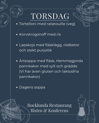 Välkommen till oss på Rocklunda Restaurang & Bistro. På denna sida hittar du information om våra aktuella öppettider, veckans meny, matlådor, och våra matpaket.